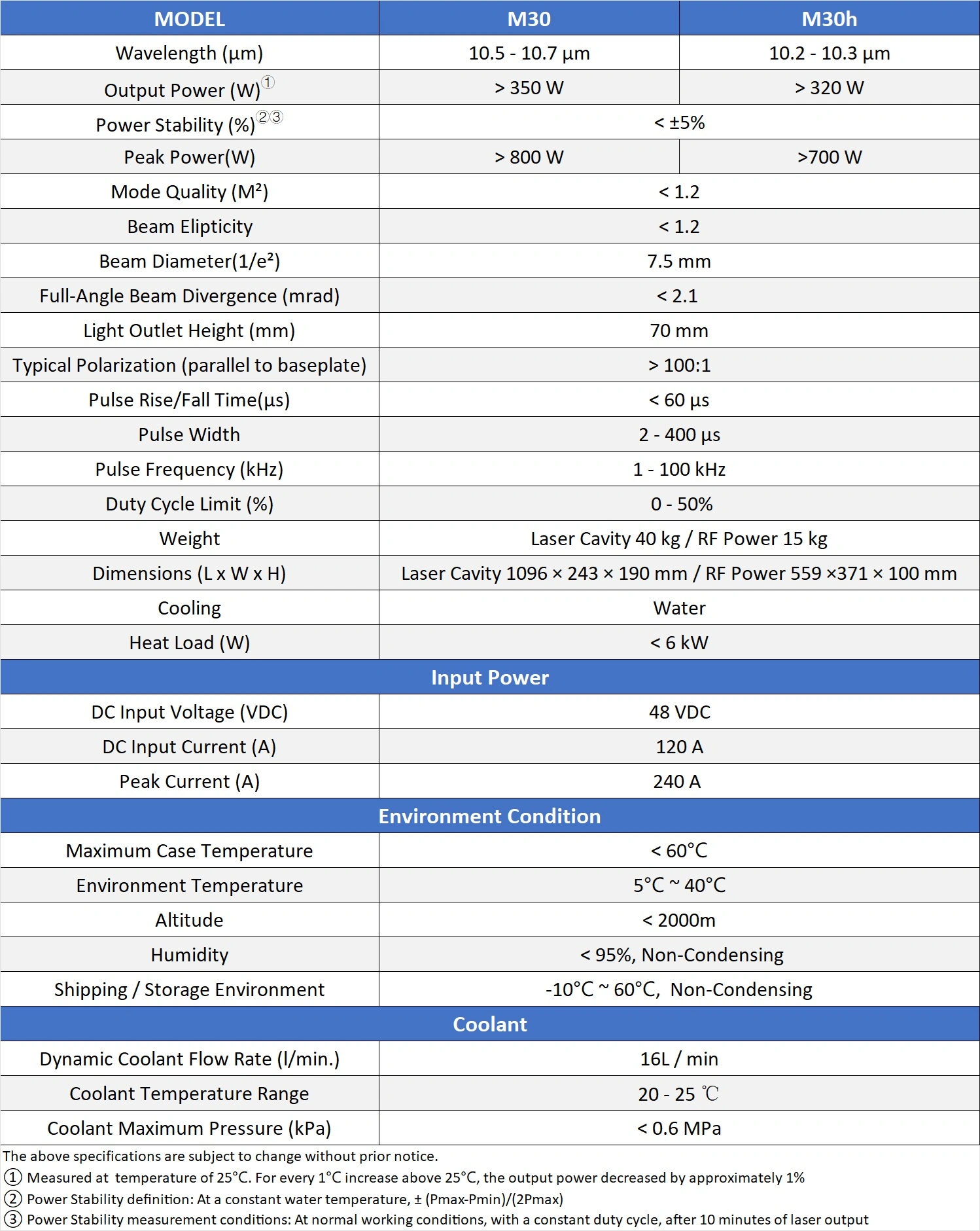 The M30 RF CO2 laser is a pulsed laser with an average power of more than 350W and a peak power of more than 800W. The product adopts a slat discharge design, has high product reliability, and can work continuously for 7×24 hours in harsh industrial environments. The M30 laser has excellent beam quality and fast pulse rise/fall time, which can minimize the heat affected zone. The laser wavelength ranges from 9.3 to 10.6μm, and the power stability is good, which can achieve excellent processing results and improve process efficiency. These characteristics make it the laser of choice for high-performance laser processing systems, and it only requires very low use and maintenance costs. The M30 laser is an ideal choice for laser processing of many materials. Applications include laser cutting, glass splintering, automotive parts processing, cloth cutting, laser cleaning, large-format marking, medical beauty and 3D printing.