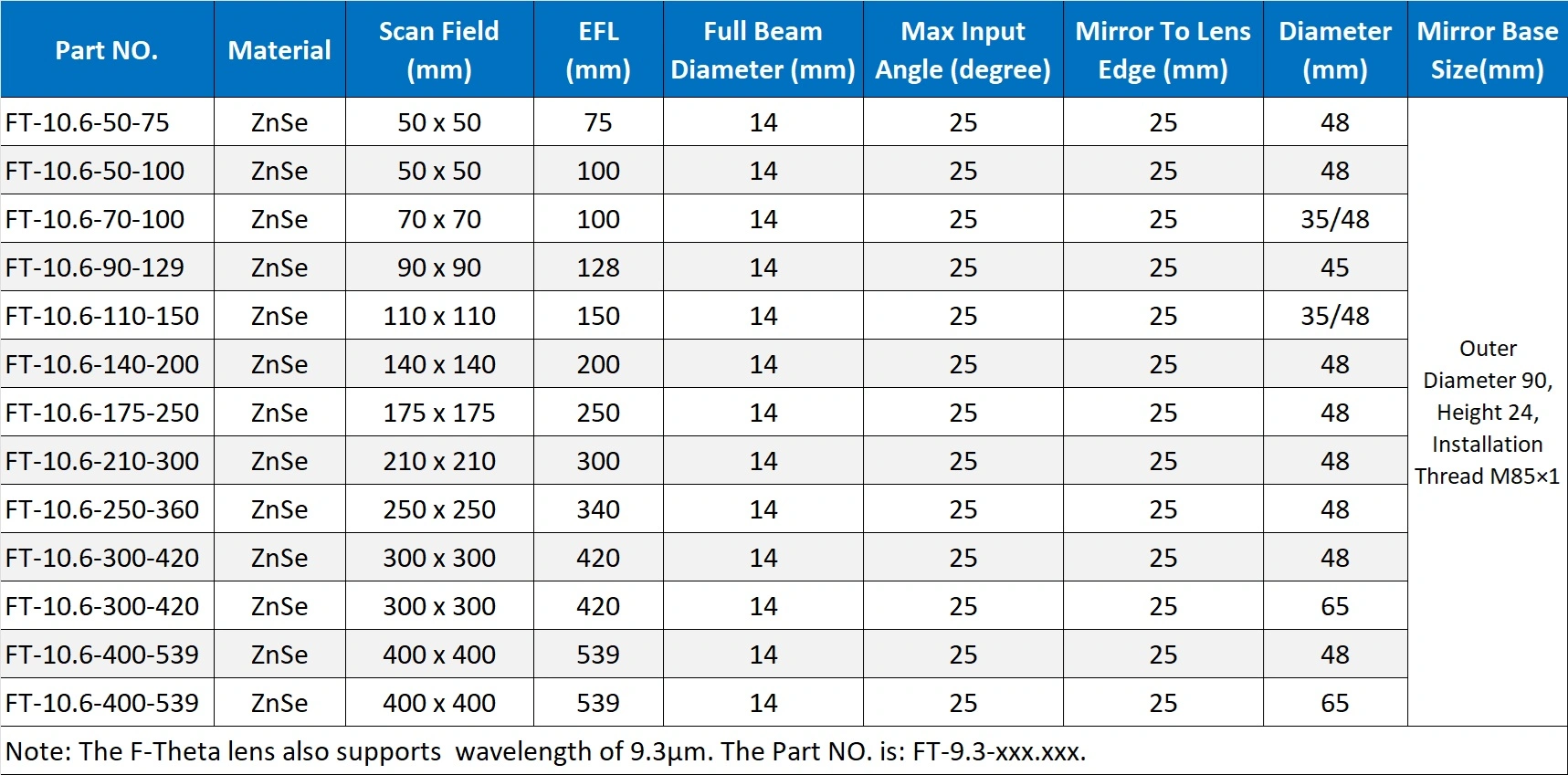 Our F-theta Scan Lens uses imported ZnSe material and is designed and produced according to the needs and characteristics of the CO2 laser marking market. The principle is to use the special dispersion properties of the material to eliminate chromatic aberration and correct aberration through the optical system, while reducing the volume and weight of the system. Aberration analysis shows that the system has excellent chromatic aberration, field curvature, and F-theta error characteristics. In particular, the output spot is small (diffraction limit) and uniform, with excellent scanning characteristics, meeting the actual needs of high-speed, high-precision laser marking machines.