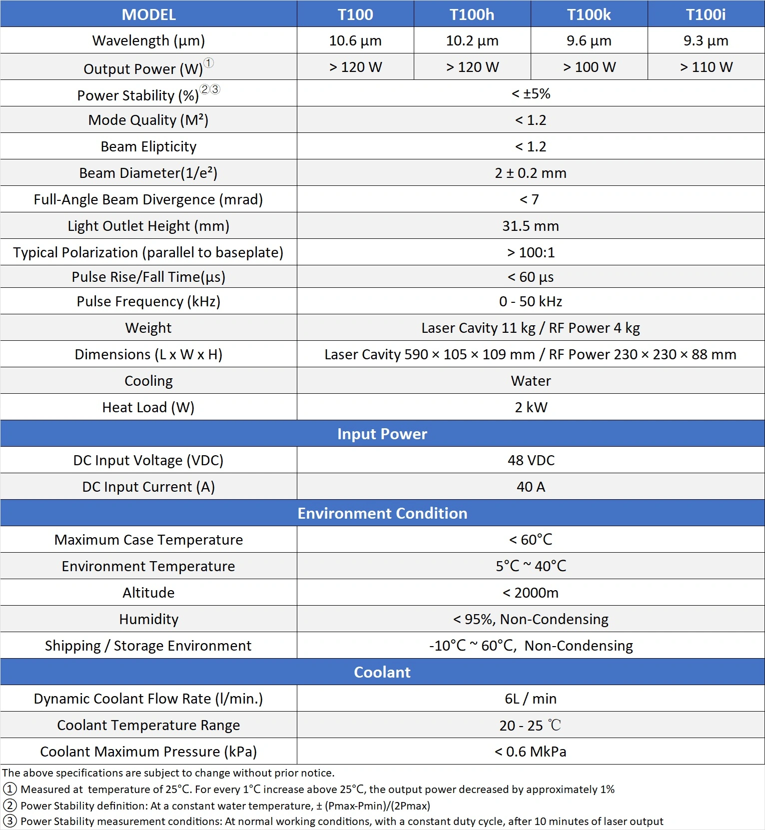 The T100 RF CO2 laser is a continuous laser that provides 120W output power. The product adopts a slat discharge design. It has high product reliability and can work continuously for 7×24 hours in harsh industrial environments. The T series laser provides excellent beam quality and power stability. The T series laser has extremely short pulse rise/fall time, which can minimize the heat-affected zone, achieve excellent processing results and improve process efficiency. The laser wavelength ranges from 9.3 to 10.6μm. These features make it the first choice for high-performance laser engraving and laser cutting systems, and it only requires very low use and maintenance costs. The T100 laser is an ideal choice for laser processing of many materials, including medical beauty, leather carving, automotive interior parts cutting, cloth cutting, glass/ceramic surface engraving, glass cracks, large-format marking, flexible integrated circuit drilling and 3D printing.