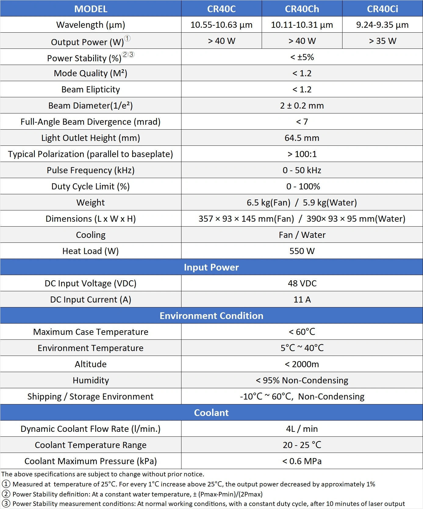 The CR40C RF CO2 laser provides 40W output power, adopts the design of sealed waveguide and integrated RF power supply, and has high product reliability. It can work continuously for 7×24 hours in harsh industrial environments. The CR40C laser has excellent beam quality and power stability. The laser wavelength ranges from 9.3 to 10.6μm, and can be configured with air cooling and water cooling. These features make it the first choice for high-performance laser marking and engraving systems, and it only requires low use and maintenance costs. The CR40C laser is an ideal choice for laser processing of many materials, including paper, plastic, acrylic, wood, rubber, leather, cloth and density fiberboard.