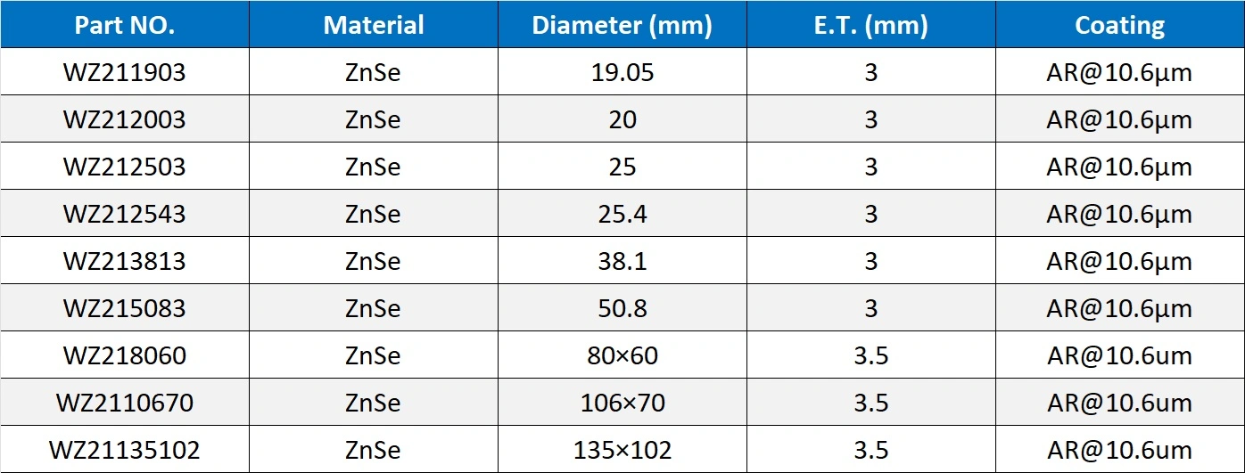 These flat windows, made of imported ZnSe material, protect valuable scanning lenses and focusing optics in industrial laser systems from debris, backsplash and other workplace hazards. These windows can be integrated directly into scanning lenses or focusing assemblies, or used separately.